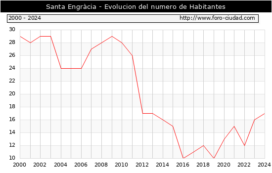 el numero de habitantes en Santa Engràcia era de 17, 1 habitantes mas que el en el año 2023. En el grafico siguiente se puede ver cuantos habitantes tiene Santa Engràcia a lo largo de los años.