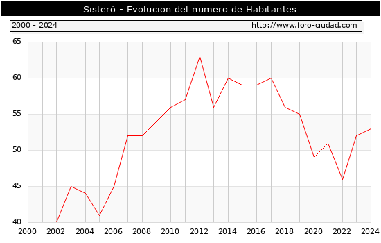 el numero de habitantes en Sisteró era de 53, 1 habitantes mas que el en el año 2023. En el grafico siguiente se puede ver cuantos habitantes tiene Sisteró a lo largo de los años.
