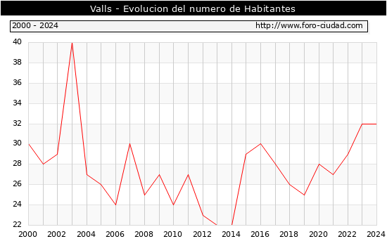 el numero de habitantes en Valls era de 32, igual numero de habitantes que el en el año 2023. En el grafico siguiente se puede ver cuantos habitantes tiene Valls a lo largo de los años.