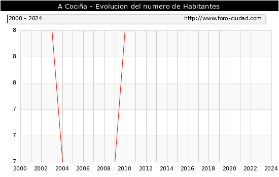 el numero de habitantes en A Cociña era de 8, igual numero de habitantes que el en el año 2023. En el grafico siguiente se puede ver cuantos habitantes tiene A Cociña a lo largo de los años.