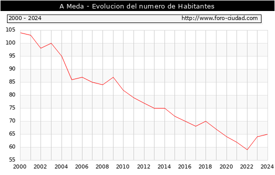 el numero de habitantes en A Meda era de 65, 1 habitantes mas que el en el año 2023. En el grafico siguiente se puede ver cuantos habitantes tiene A Meda a lo largo de los años.