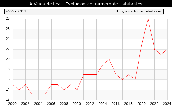 el numero de habitantes en A Veiga de Lea era de 22, 1 habitantes mas que el en el año 2023. En el grafico siguiente se puede ver cuantos habitantes tiene A Veiga de Lea a lo largo de los años.