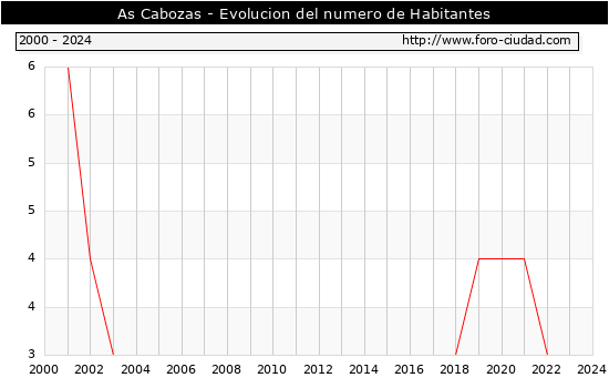 el numero de habitantes en As Cabozas era de 3, igual numero de habitantes que el en el año 2023. En el grafico siguiente se puede ver cuantos habitantes tiene As Cabozas a lo largo de los años.