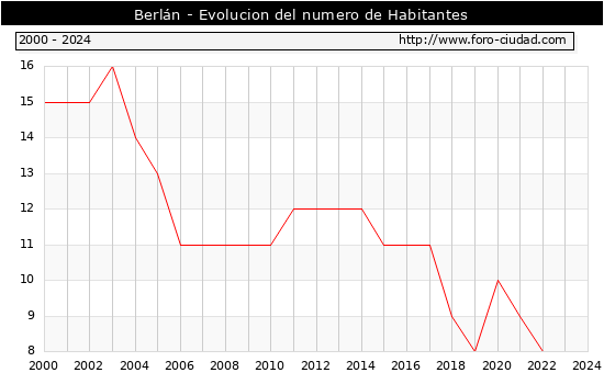 el numero de habitantes en Berlán era de 8, igual numero de habitantes que el en el año 2023. En el grafico siguiente se puede ver cuantos habitantes tiene Berlán a lo largo de los años.