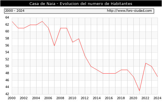 el numero de habitantes en Casa de Naia era de 47, 3 habitantes menos que el en el año 2023. En el grafico siguiente se puede ver cuantos habitantes tiene Casa de Naia a lo largo de los años.