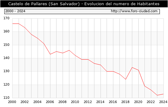 el numero de habitantes en Castelo de Pallares (San Salvador) era de 113, 1 habitantes mas que el en el año 2023. En el grafico siguiente se puede ver cuantos habitantes tiene Castelo de Pallares (San Salvador) a lo largo de los años.