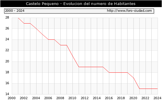 el numero de habitantes en Castelo Pequeno era de 15, igual numero de habitantes que el en el año 2023. En el grafico siguiente se puede ver cuantos habitantes tiene Castelo Pequeno a lo largo de los años.