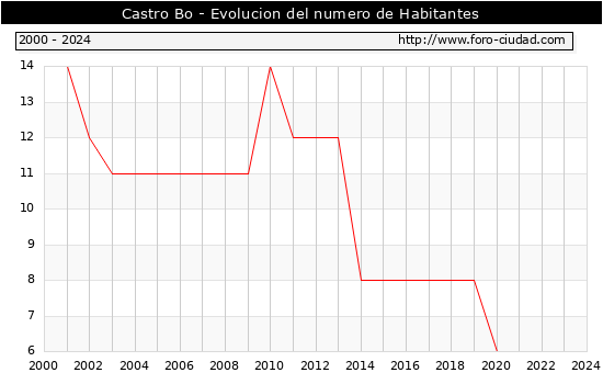el numero de habitantes en Castro Bo era de 6, igual numero de habitantes que el en el año 2023. En el grafico siguiente se puede ver cuantos habitantes tiene Castro Bo a lo largo de los años.