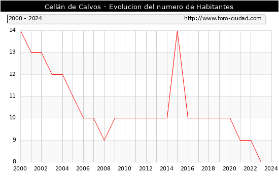 el numero de habitantes en Cellán de Calvos era de 8, igual numero de habitantes que el en el año 2023. En el grafico siguiente se puede ver cuantos habitantes tiene Cellán de Calvos a lo largo de los años.