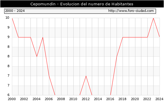 el numero de habitantes en Cepomundín era de 9, 1 habitantes menos que el en el año 2023. En el grafico siguiente se puede ver cuantos habitantes tiene Cepomundín a lo largo de los años.