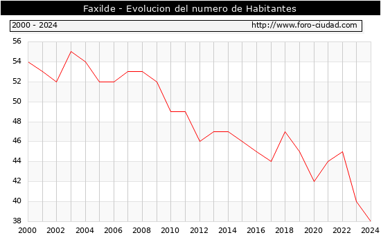 el numero de habitantes en Faxilde era de 38, 2 habitantes menos que el en el año 2023. En el grafico siguiente se puede ver cuantos habitantes tiene Faxilde a lo largo de los años.