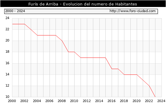 el numero de habitantes en Furís de Arriba era de 10, igual numero de habitantes que el en el año 2023. En el grafico siguiente se puede ver cuantos habitantes tiene Furís de Arriba a lo largo de los años.