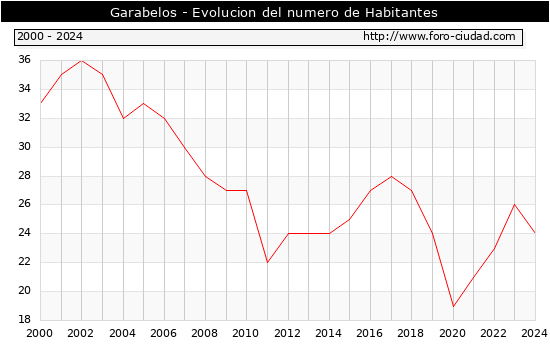 el numero de habitantes en Garabelos era de 24, 2 habitantes menos que el en el año 2023. En el grafico siguiente se puede ver cuantos habitantes tiene Garabelos a lo largo de los años.