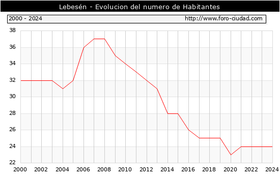 el numero de habitantes en Lebesén era de 24, igual numero de habitantes que el en el año 2023. En el grafico siguiente se puede ver cuantos habitantes tiene Lebesén a lo largo de los años.