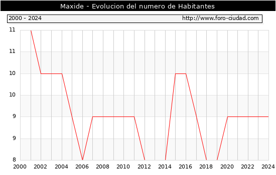 el numero de habitantes en Maxide era de 9, igual numero de habitantes que el en el año 2023. En el grafico siguiente se puede ver cuantos habitantes tiene Maxide a lo largo de los años.