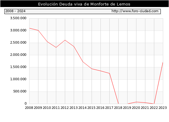 Monforte de Lemos - Deuda viva del Ayuntamiento a 31/12/2024 Monforte de Lemos - Deuda viva del Ayuntamiento a 31/12/2024 Segun el Ministerio de Economia y Hacienda el Ayuntamiento de Monforte de Lemos a 31/12/2024 posee una deuda de 1.723.000 € . La deuda viva a 31/12/2023 ascendia a 1.724.000 € por lo que en el ultimo año la deuda se redujo en -1.000 €. ![]()