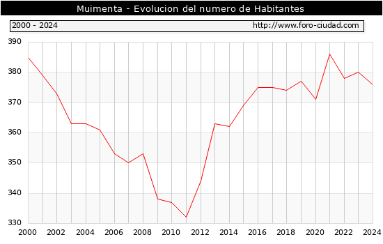 el numero de habitantes en Muimenta era de 376, 4 habitantes menos que el en el año 2023. En el grafico siguiente se puede ver cuantos habitantes tiene Muimenta a lo largo de los años.