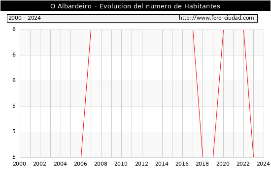 el numero de habitantes en O Albardeiro era de 5, igual numero de habitantes que el en el año 2023. En el grafico siguiente se puede ver cuantos habitantes tiene O Albardeiro a lo largo de los años.
