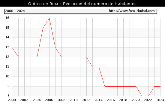 el numero de habitantes en O Arco de Riba era de 9, igual numero de habitantes que el en el año 2023. En el grafico siguiente se puede ver cuantos habitantes tiene O Arco de Riba a lo largo de los años.