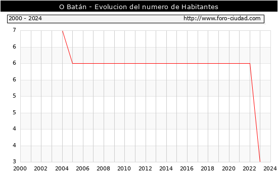 el numero de habitantes en O Batán era de 3, igual numero de habitantes que el en el año 2023. En el grafico siguiente se puede ver cuantos habitantes tiene O Batán a lo largo de los años.