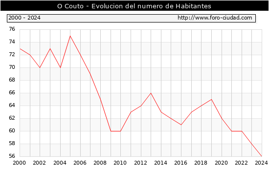 el numero de habitantes en O Couto era de 56, 2 habitantes menos que el en el año 2023. En el grafico siguiente se puede ver cuantos habitantes tiene O Couto a lo largo de los años.
