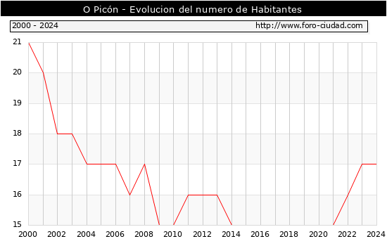 el numero de habitantes en O Picón era de 17, igual numero de habitantes que el en el año 2023. En el grafico siguiente se puede ver cuantos habitantes tiene O Picón a lo largo de los años.