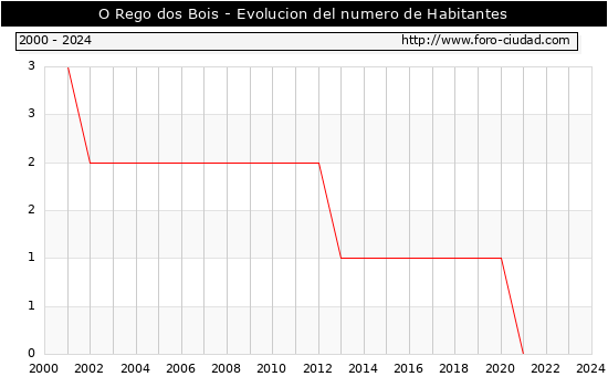el numero de habitantes en O Rego dos Bois era de 0, igual numero de habitantes que el en el año 2023. En el grafico siguiente se puede ver cuantos habitantes tiene O Rego dos Bois a lo largo de los años.