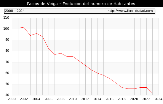 el numero de habitantes en Pacios de Veiga era de 42, igual numero de habitantes que el en el año 2023. En el grafico siguiente se puede ver cuantos habitantes tiene Pacios de Veiga a lo largo de los años.