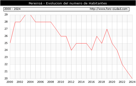 el numero de habitantes en Pereiroá era de 20, 1 habitantes menos que el en el año 2023. En el grafico siguiente se puede ver cuantos habitantes tiene Pereiroá a lo largo de los años.