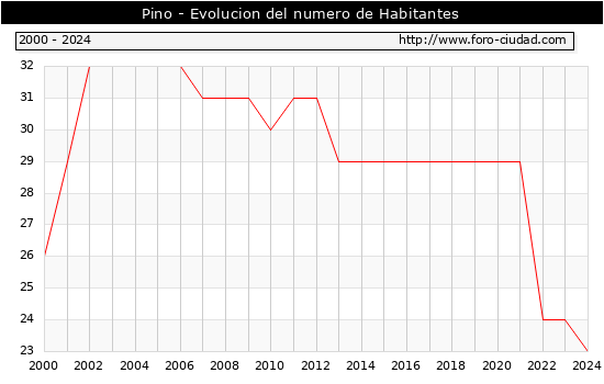 el numero de habitantes en Pino era de 23, 1 habitantes menos que el en el año 2023. En el grafico siguiente se puede ver cuantos habitantes tiene Pino a lo largo de los años.