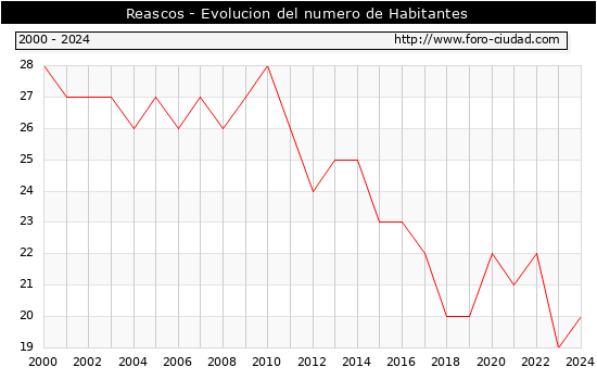 el numero de habitantes en Reascos era de 20, 1 habitantes mas que el en el año 2023. En el grafico siguiente se puede ver cuantos habitantes tiene Reascos a lo largo de los años.