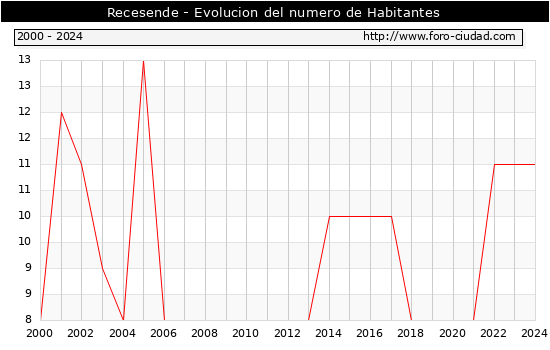el numero de habitantes en Recesende era de 11, igual numero de habitantes que el en el año 2023. En el grafico siguiente se puede ver cuantos habitantes tiene Recesende a lo largo de los años.
