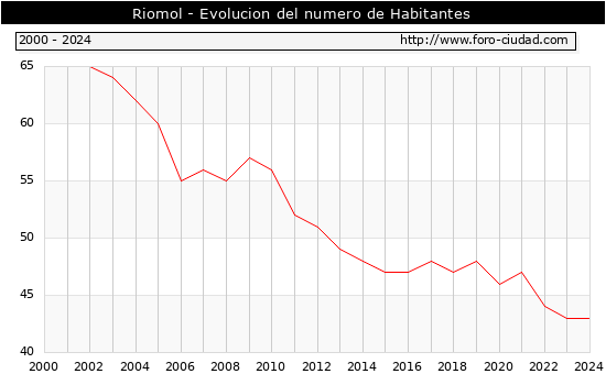el numero de habitantes en Riomol era de 43, igual numero de habitantes que el en el año 2023. En el grafico siguiente se puede ver cuantos habitantes tiene Riomol a lo largo de los años.