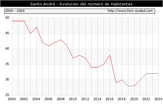 el numero de habitantes en Santo André era de 32, igual numero de habitantes que el en el año 2023. En el grafico siguiente se puede ver cuantos habitantes tiene Santo André a lo largo de los años.