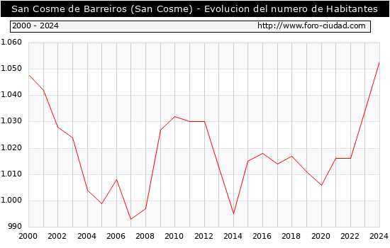 el numero de habitantes en San Cosme de Barreiros (San Cosme) era de 1.053, 19 habitantes mas que el en el año 2023. En el grafico siguiente se puede ver cuantos habitantes tiene San Cosme de Barreiros (San Cosme) a lo largo de los años.