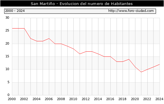 el numero de habitantes en San Martiño era de 12, 1 habitantes mas que el en el año 2023. En el grafico siguiente se puede ver cuantos habitantes tiene San Martiño a lo largo de los años.