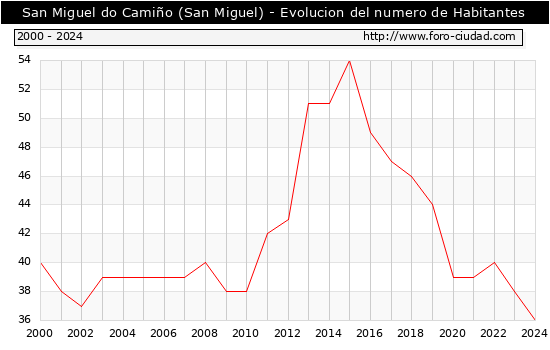 el numero de habitantes en San Miguel do Camiño (San Miguel) era de 36, 2 habitantes menos que el en el año 2023. En el grafico siguiente se puede ver cuantos habitantes tiene San Miguel do Camiño (San Miguel) a lo largo de los años.
