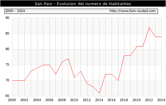 el numero de habitantes en San Paio era de 84, igual numero de habitantes que el en el año 2023. En el grafico siguiente se puede ver cuantos habitantes tiene San Paio a lo largo de los años.