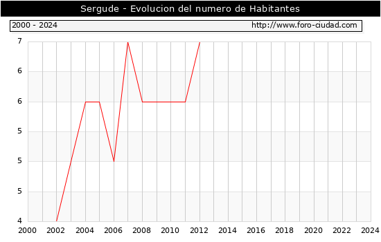 el numero de habitantes en Sergude era de 7, igual numero de habitantes que el en el año 2023. En el grafico siguiente se puede ver cuantos habitantes tiene Sergude a lo largo de los años.