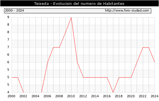 el numero de habitantes en Teixeda era de 6, 1 habitantes menos que el en el año 2023. En el grafico siguiente se puede ver cuantos habitantes tiene Teixeda a lo largo de los años.