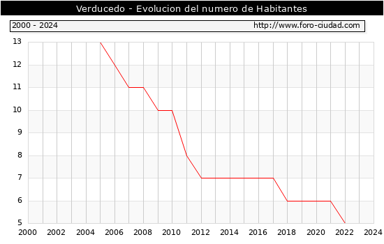 el numero de habitantes en Verducedo era de 5, igual numero de habitantes que el en el año 2023. En el grafico siguiente se puede ver cuantos habitantes tiene Verducedo a lo largo de los años.