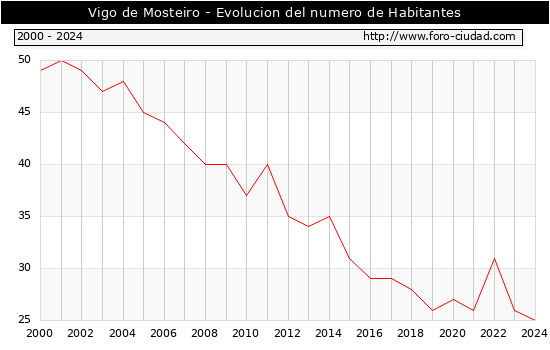 el numero de habitantes en Vigo de Mosteiro era de 25, 1 habitantes menos que el en el año 2023. En el grafico siguiente se puede ver cuantos habitantes tiene Vigo de Mosteiro a lo largo de los años.