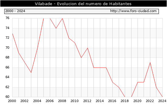 el numero de habitantes en Vilabade era de 60, 2 habitantes menos que el en el año 2023. En el grafico siguiente se puede ver cuantos habitantes tiene Vilabade a lo largo de los años.