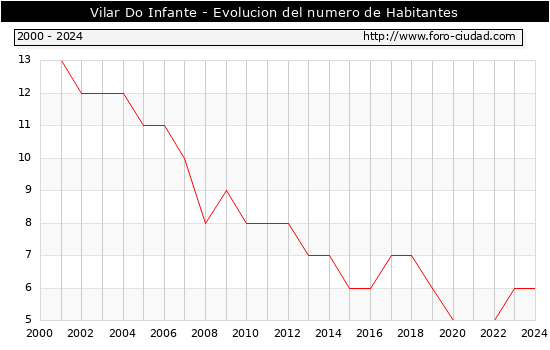 el numero de habitantes en Vilar Do Infante era de 6, igual numero de habitantes que el en el año 2023. En el grafico siguiente se puede ver cuantos habitantes tiene Vilar Do Infante a lo largo de los años.