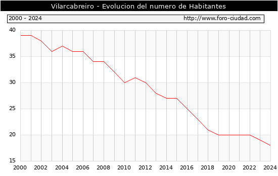 el numero de habitantes en Vilarcabreiro era de 18, 1 habitantes menos que el en el año 2023. En el grafico siguiente se puede ver cuantos habitantes tiene Vilarcabreiro a lo largo de los años.