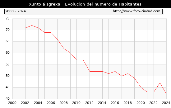el numero de habitantes en Xunto á Igrexa era de 42, 5 habitantes menos que el en el año 2023. En el grafico siguiente se puede ver cuantos habitantes tiene Xunto á Igrexa a lo largo de los años.
