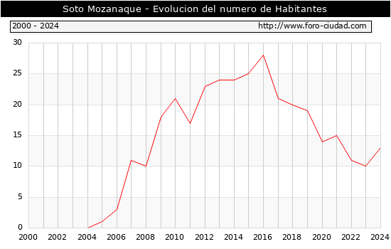 el numero de habitantes en Soto Mozanaque era de 13, 3 habitantes mas que el en el año 2023. En el grafico siguiente se puede ver cuantos habitantes tiene Soto Mozanaque a lo largo de los años.