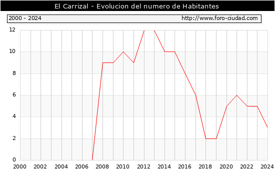 Segun los datos publicados por el INE a 1 de Enero de 2024 el numero de habitantes en El Carrizal era de 3, 2 habitantes menos que el en el año 2023. En el grafico siguiente se puede ver cuantos habitantes tiene El Carrizal a lo largo de los años.