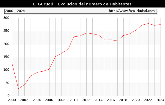 el numero de habitantes en El Gurugú era de 276, 4 habitantes mas que el en el año 2023. En el grafico siguiente se puede ver cuantos habitantes tiene El Gurugú a lo largo de los años.