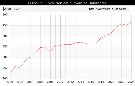 el numero de habitantes en El Pocillo era de 466, 16 habitantes mas que el en el año 2023. En el grafico siguiente se puede ver cuantos habitantes tiene El Pocillo a lo largo de los años.